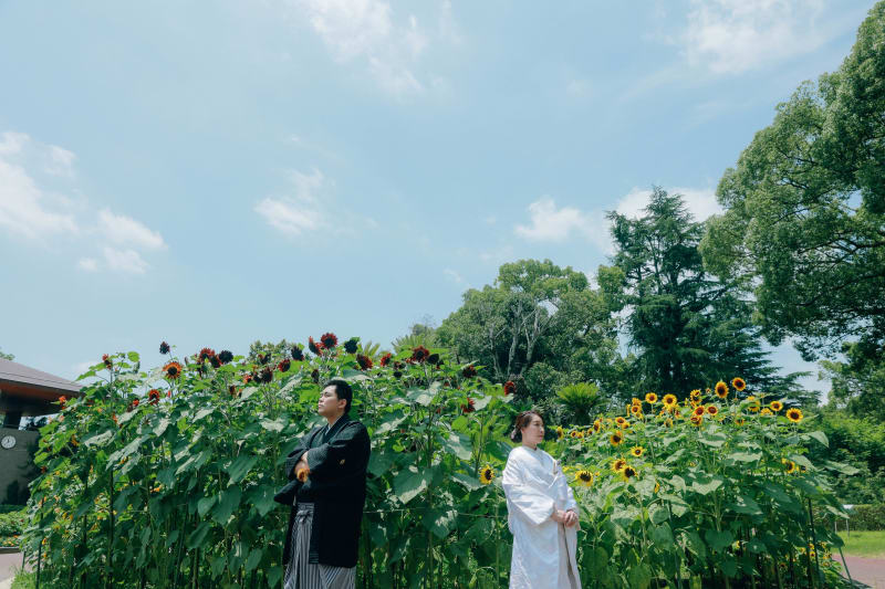 透き通る青空の下、おふたりよりも背の高いひまわりと緑がより爽やかさを引き立てますね!