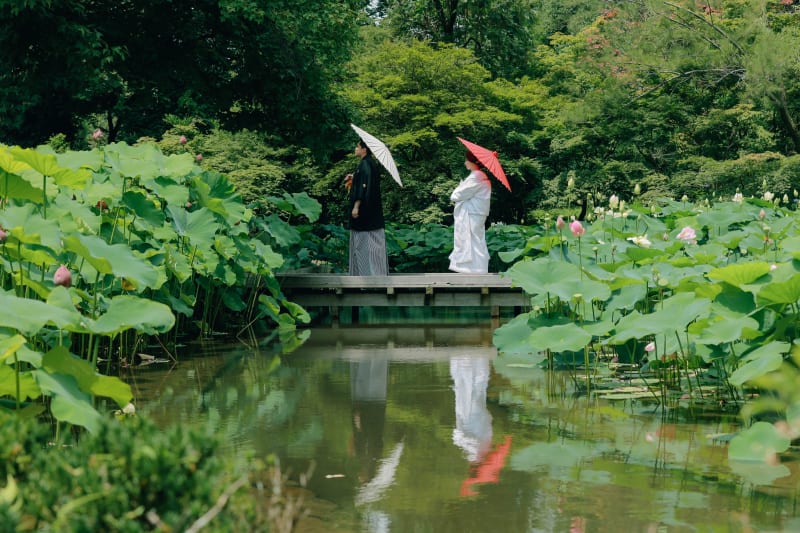 鏡のようになっていて、まるで池のお二人は絵画のようですね!