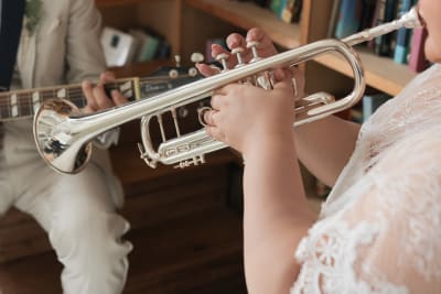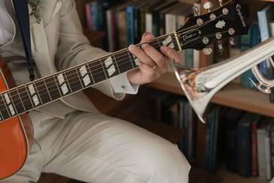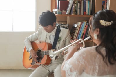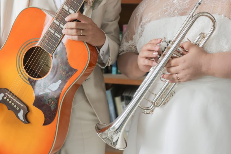 お二人の大切な楽器と指輪が一緒に写るような手元ショットも。