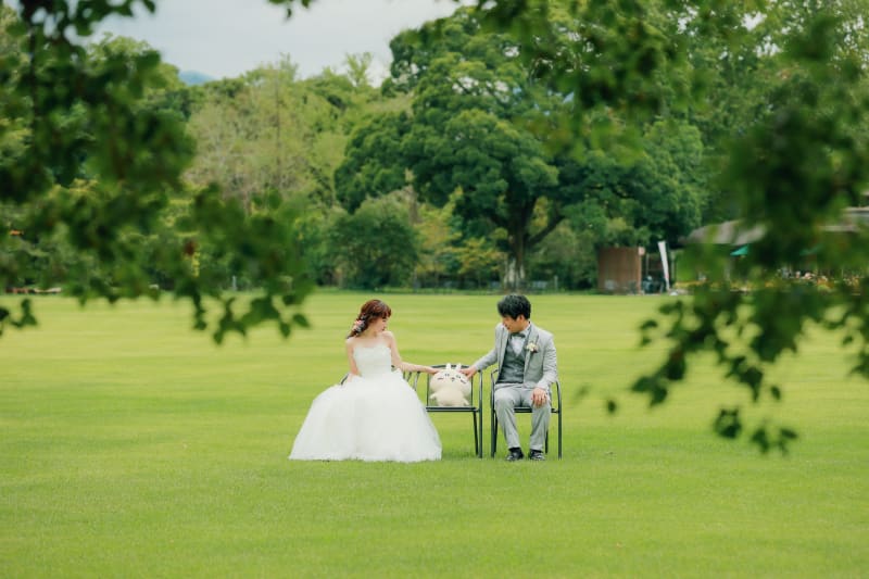 まるで、鏡の世界のような大きな池に映るおふたり♡爽やかな雰囲気が伝わってきますね!