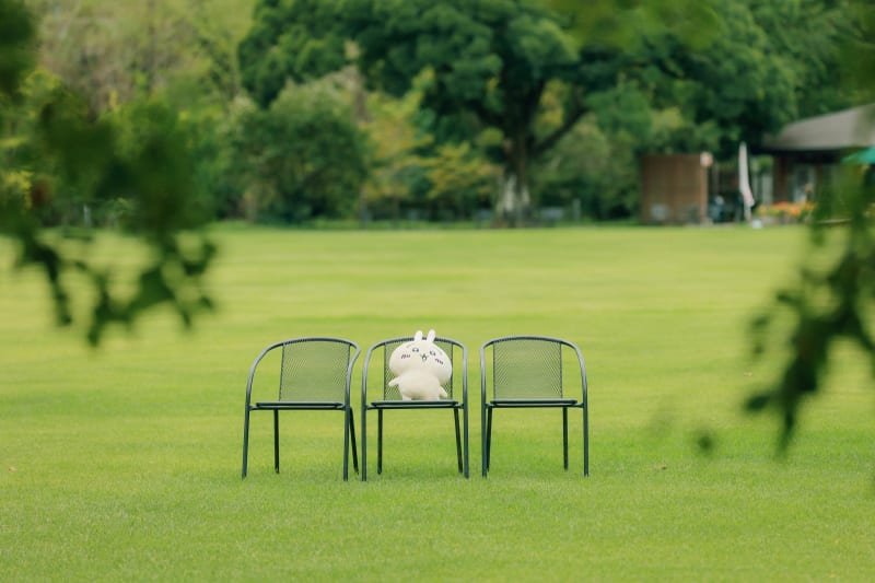 緑に囲まれて椅子に座るちいかわちゃん、気持ちよさそう^^ 可愛いフォルムがなんとも言えませんね♡