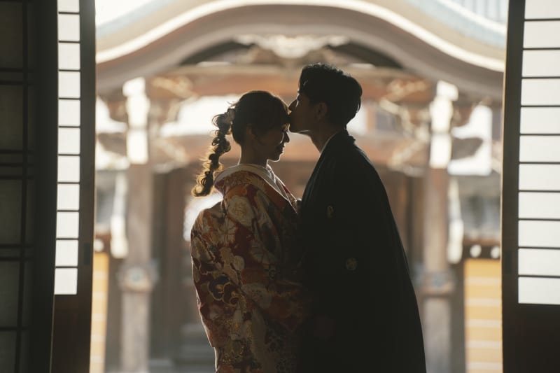 お寺や神社などで撮影をさせていただく際は、神様にご挨拶しています。そんなお姿も思い出にパシャリ!