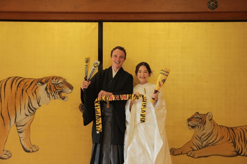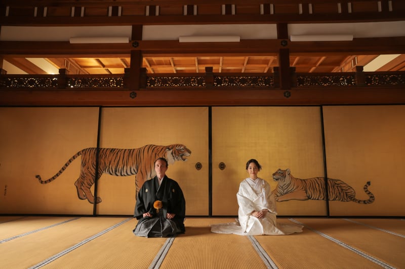 虎の襖絵の前で正座カット。先ほどとはまた印象の変わった1枚となりました。