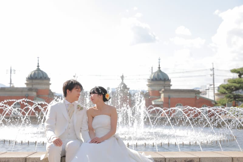 噴水の前で見つめあうおふたり。タイミングが良ければ噴水と撮影することもできます!