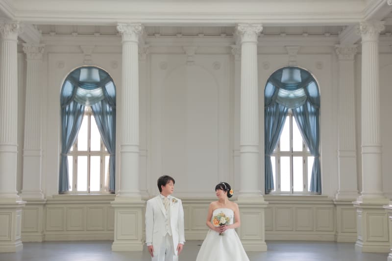 白を基調とした明治古都館に白のドレスとタキシードが合っていますね