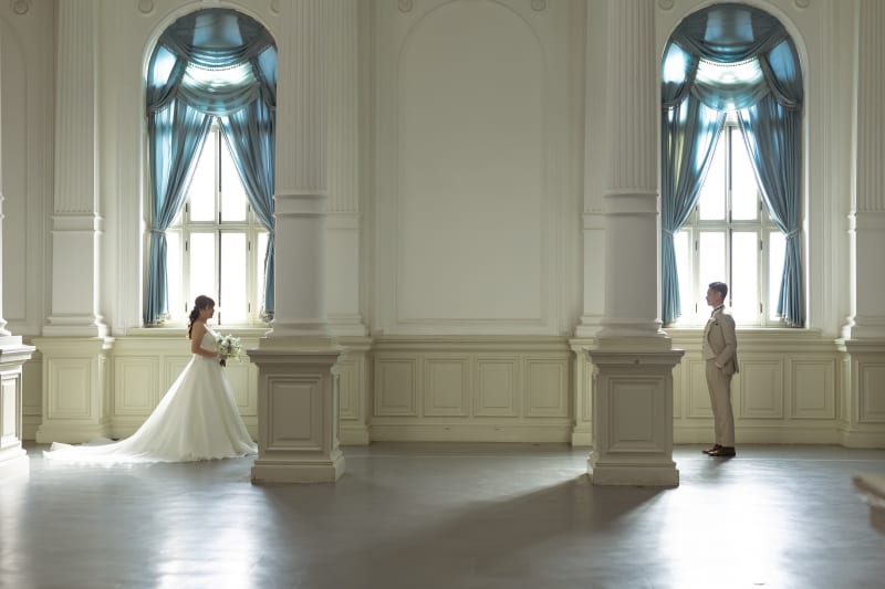 差し込む光に真っ白なドレスが映えます