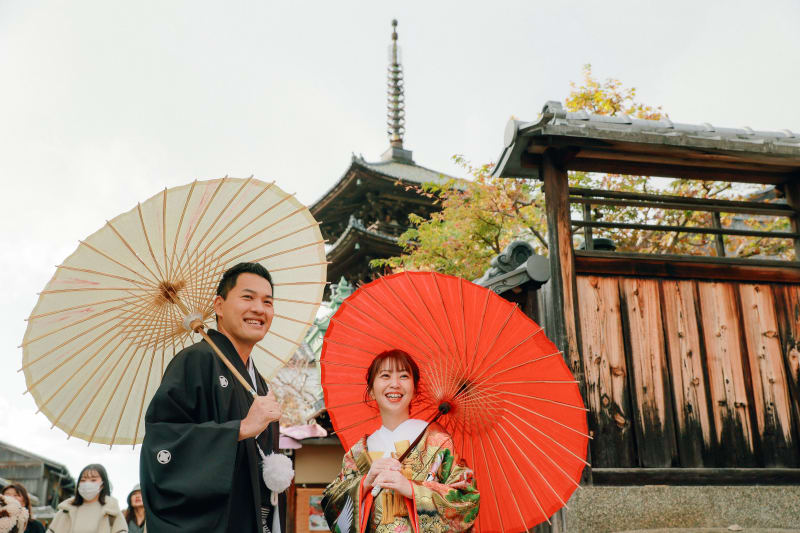 八坂の街並みに色鮮やかな色打掛が映えます♪