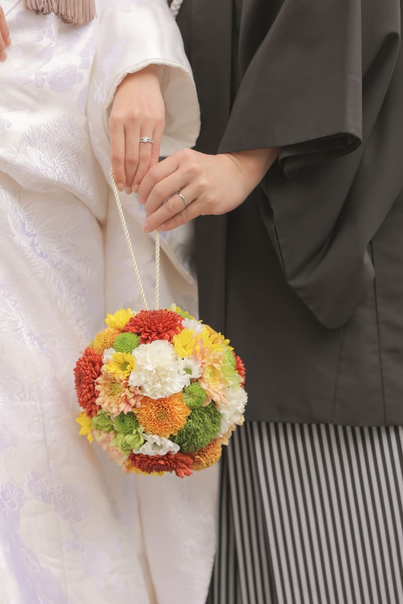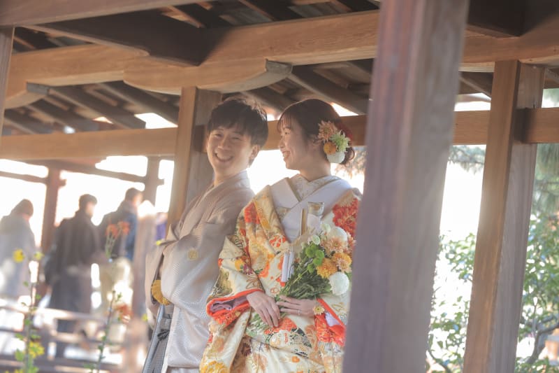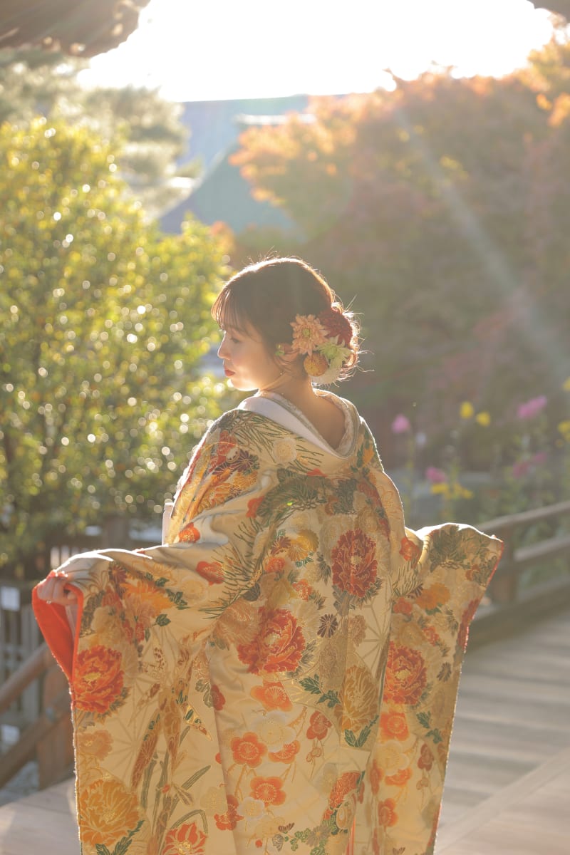 続いて村雨の廊下で撮影。髪飾りもブーケも色打掛に合っていて可愛かったです!