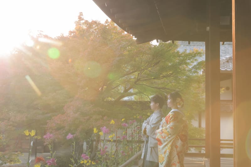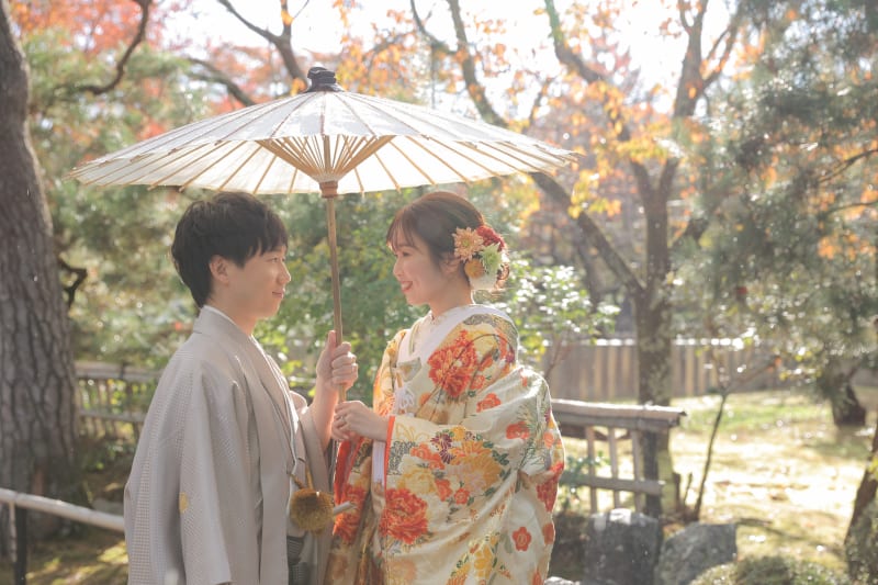 大覚寺についた瞬間、雹が降ってきました!おふたりもスタッフもテンション上げ上げで撮影しました笑