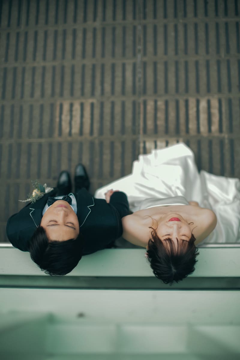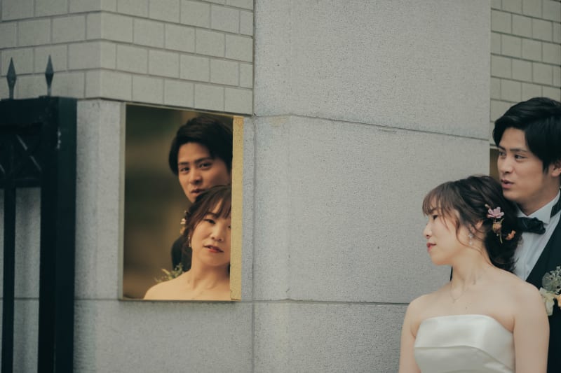 街中に鏡を見つけて、その鏡越しにお二人の表情を撮影してみました。