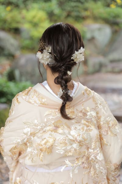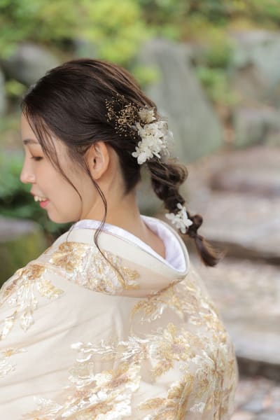 髪飾りは今話題のアメリカンフラワーとドライフラワーを混ぜて可愛らしいヘアセットになりました!