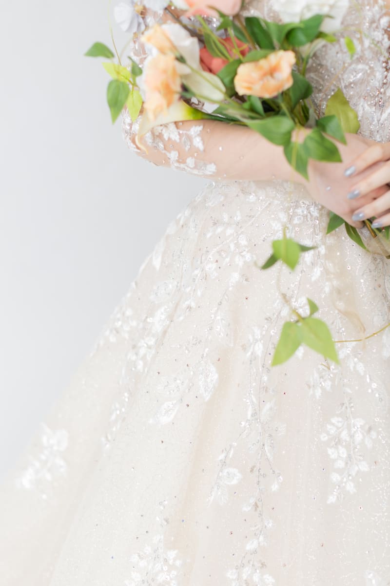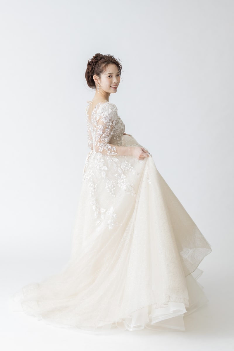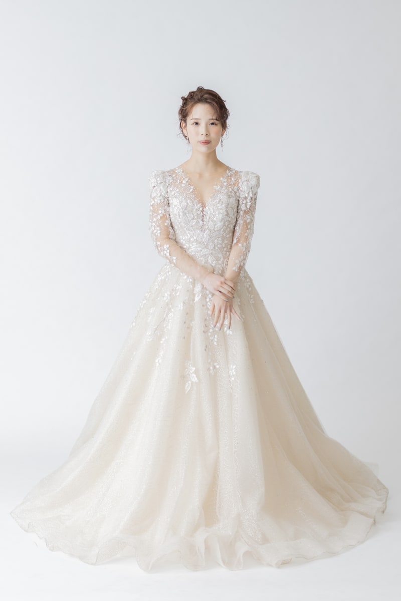 デコルテから肩、腕までが美しいリーフ刺繍と透け感で覆われた上品でエレガントなウェディングドレス。
