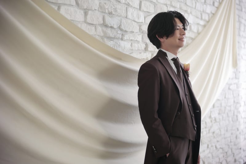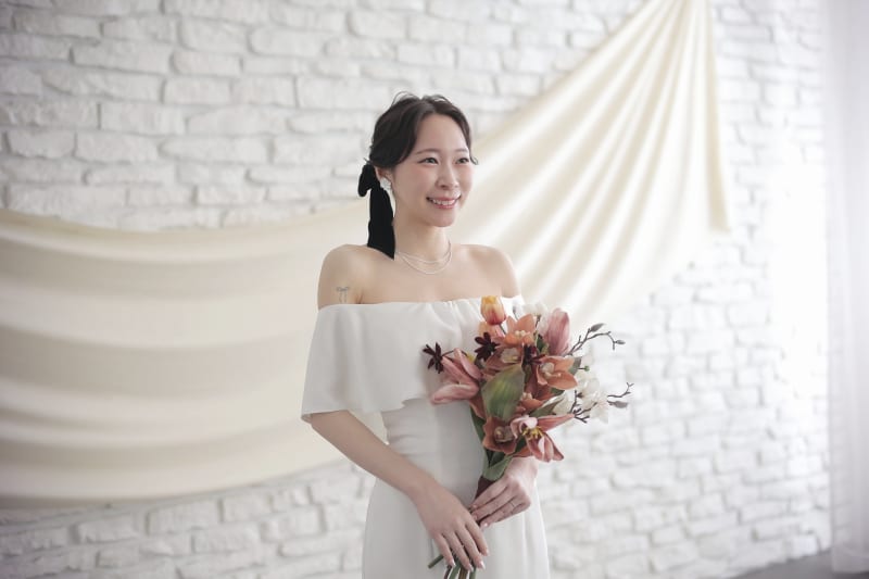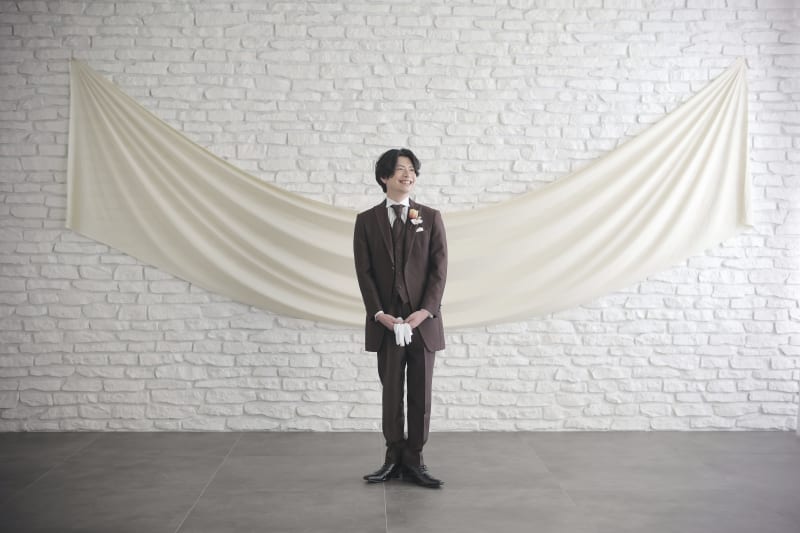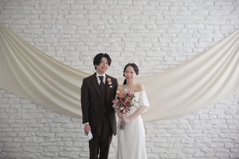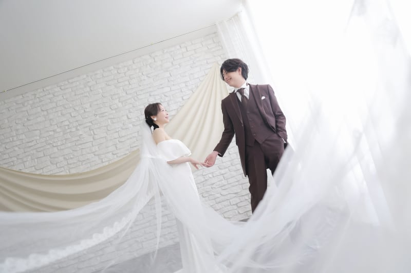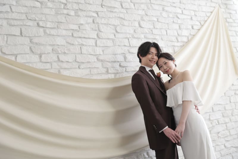 笑顔が素敵なお二人の仲の良さが、スタジオ全体に広がっていたんです。スタジオ内の布を活かした柔らかな背景では、布のドレープがなんとも言えない優雅さを演出してくれました。