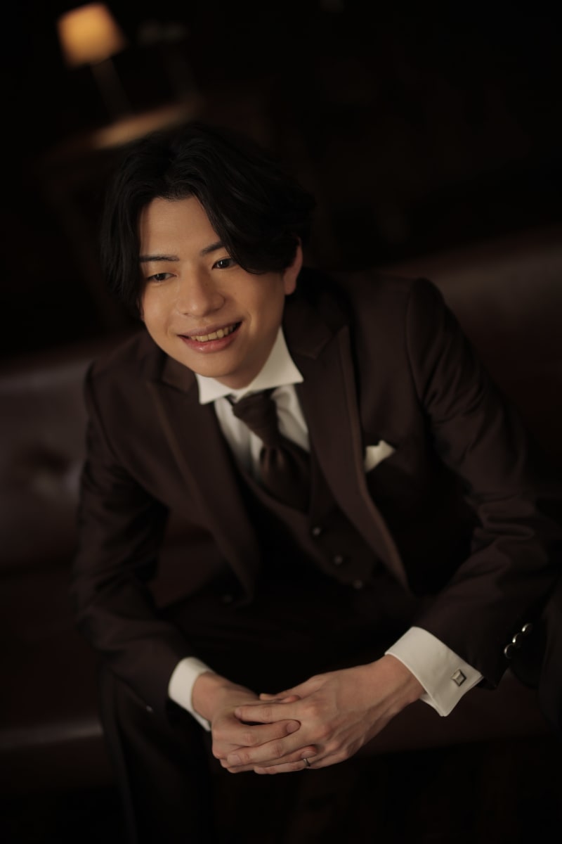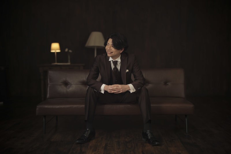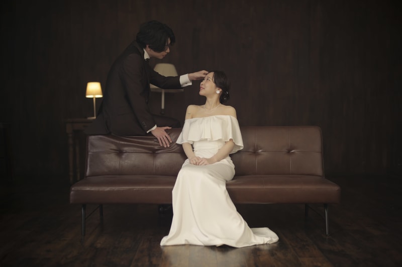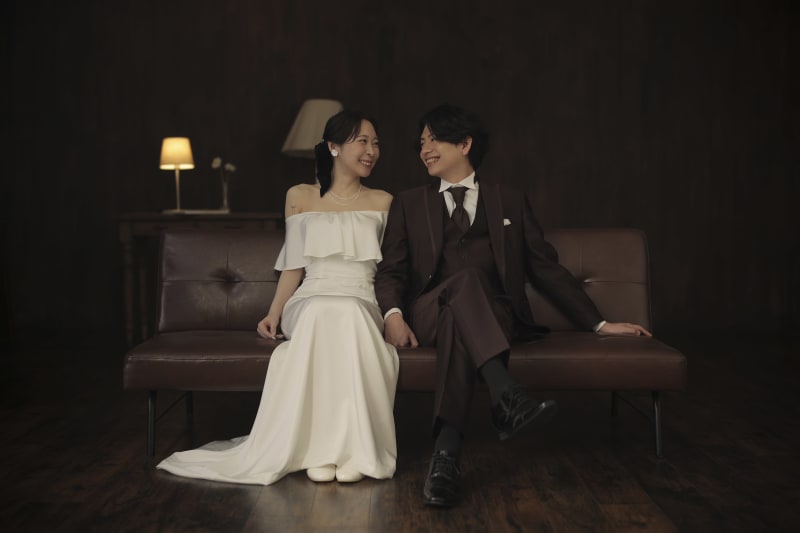アンティークなコーナーでは、木目の背景とブラウンのソファーがシックな雰囲気を作り出し、机とスタンドライトが温かく照らしました。まるでクラシックな映画のワンシーンのようで、お二人の笑顔がさらに引き立っていました。