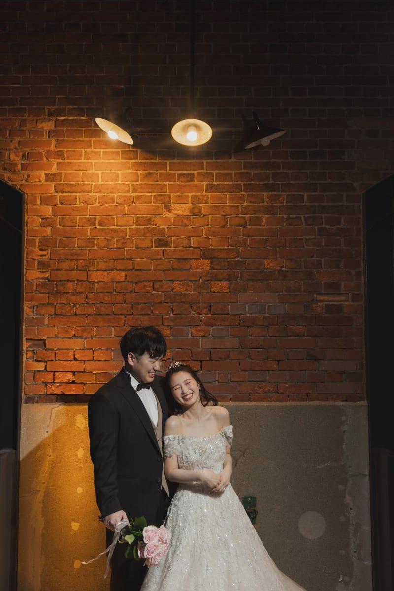 レンガ壁の前で、ふたりで自然に笑い合った瞬間。