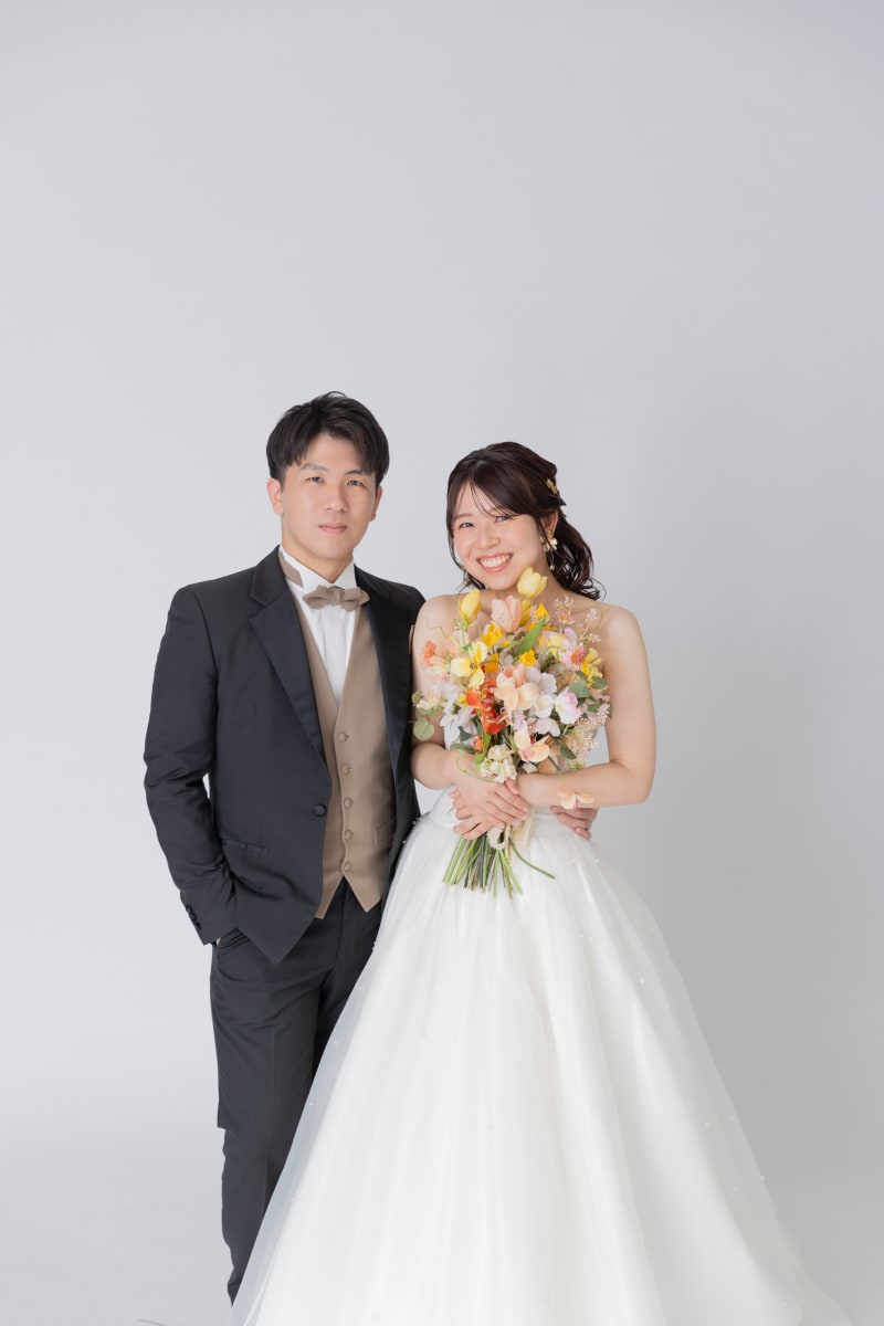 白を基調としたシンプルで明るいスタジオは、ドレスやタキシード・ブーケの彩りが映える優しく上品な空間です。
