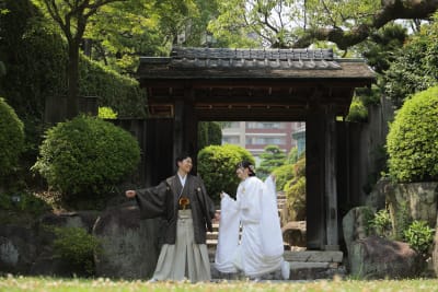 都会ながら入口からの大きな門は和装に合う目を引く撮影スポットです!