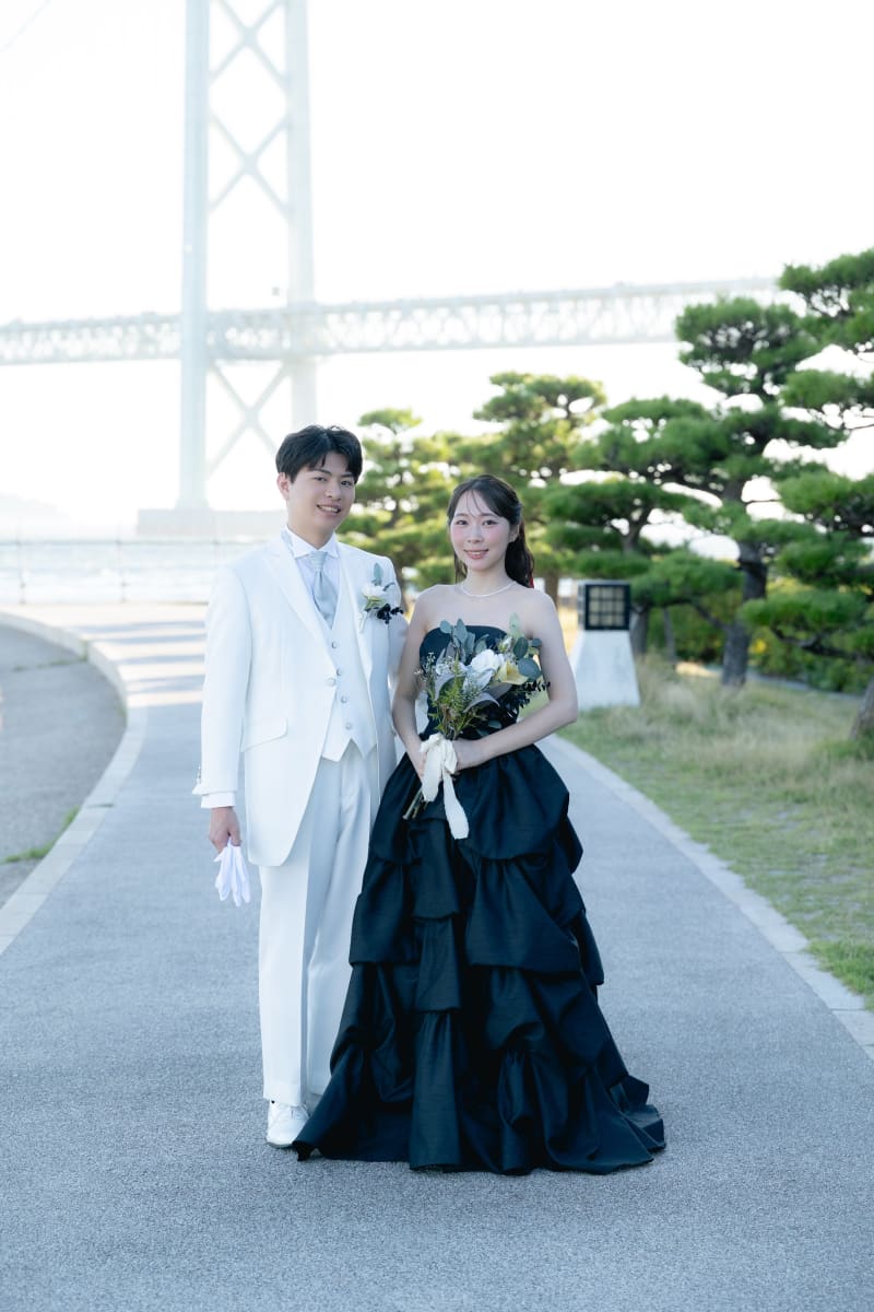 真っ白な衣装の新郎様と黒のドレスの新婦様が対照的な色で、とても素敵でした。