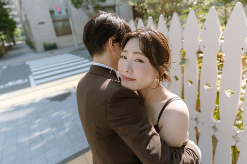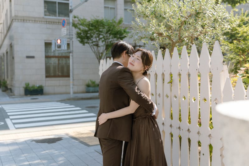 次は白い木製フェンスの前でハグをしてもらいました。