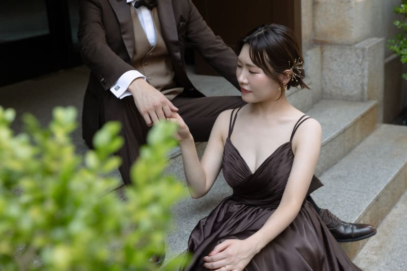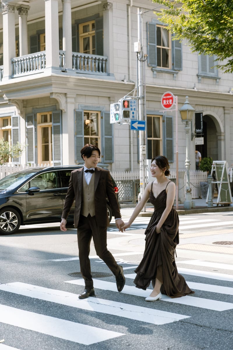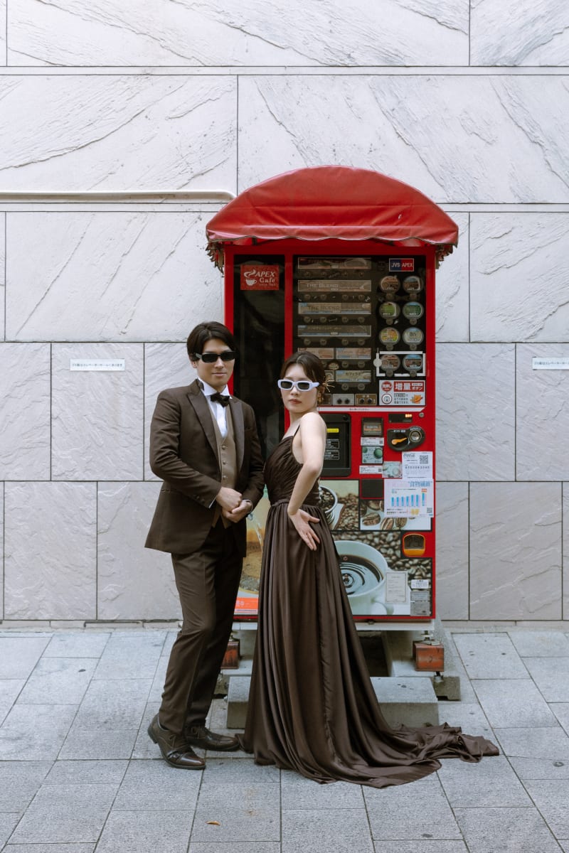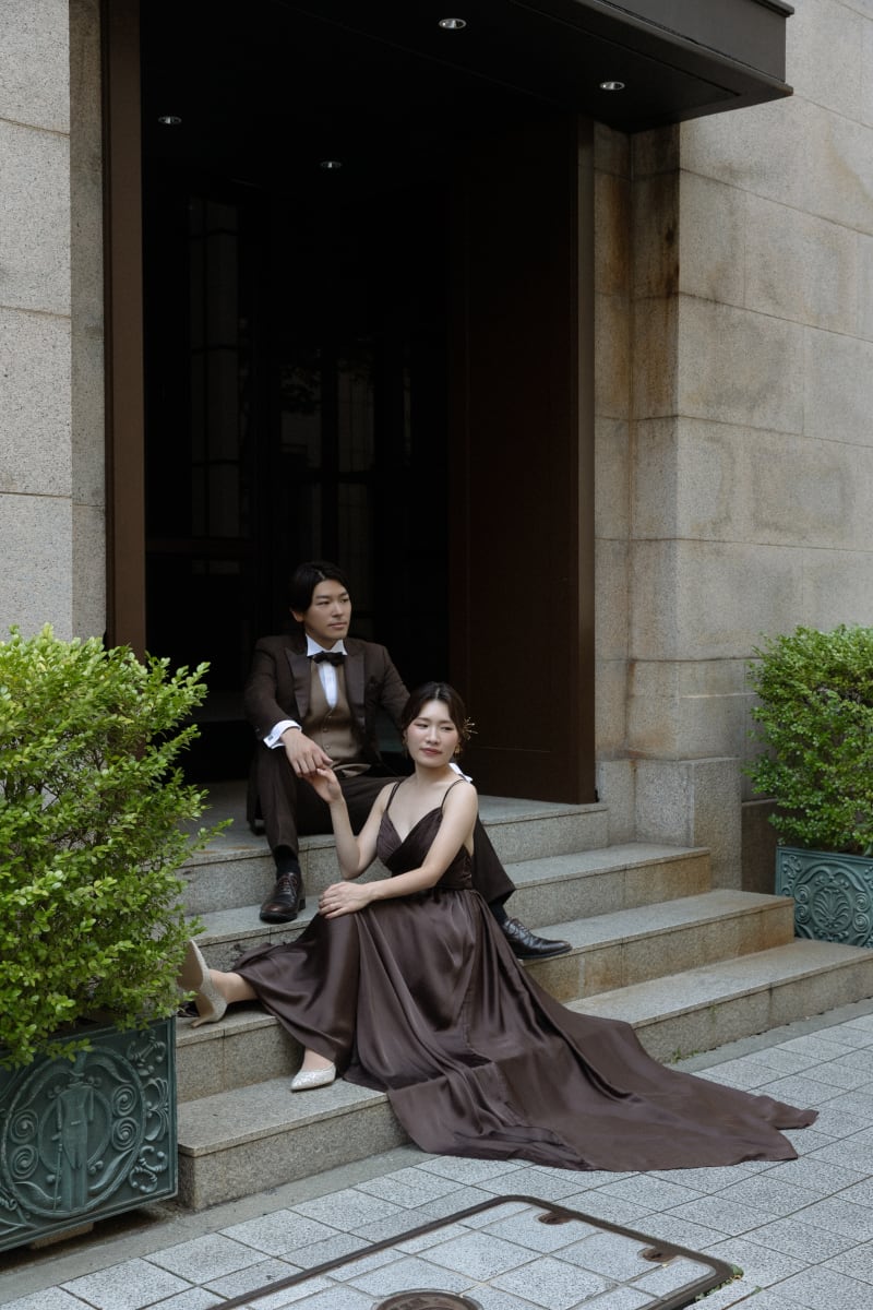 お二人のタキシードとドレスは、ブラウンのシックなトーンで統一されており