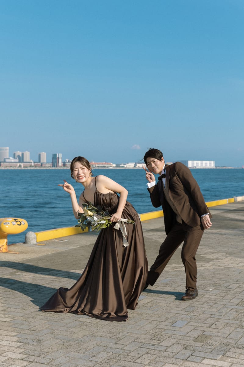 お二人のお召し物のシックな色合いが、青空と海のブルーに映えていますね✨