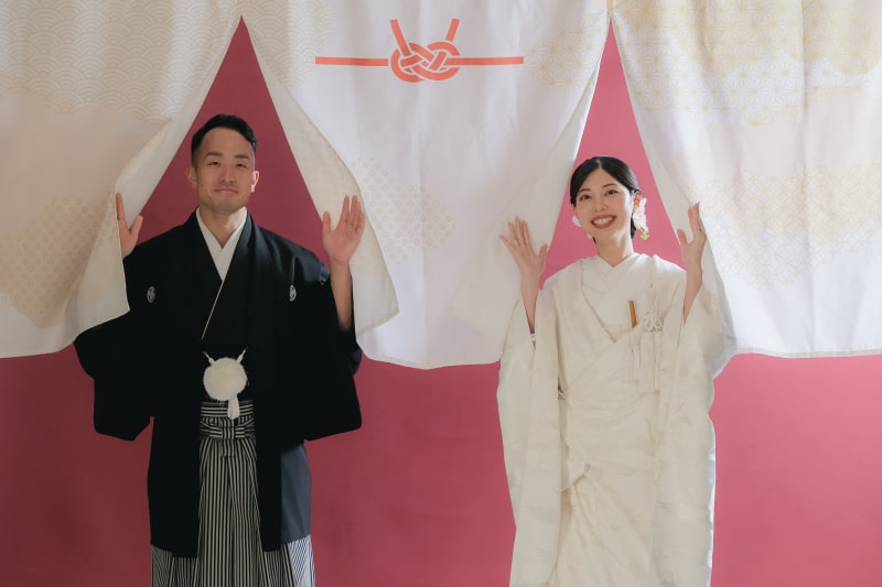 紅白の暖簾が空間を彩り、白無垢姿の新婦様と黒紋付きの新郎様が並ぶ姿は、晴れの日にふさわしい華やかさに包まれました。
