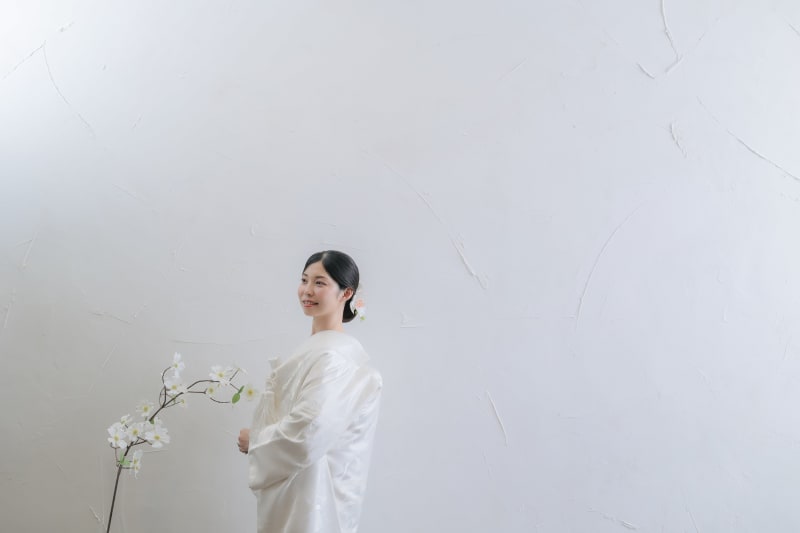 白無垢に合わせた白い花やボタニカルテイストの小物を取り入れ、上品でナチュラルな雰囲気に仕上げています。