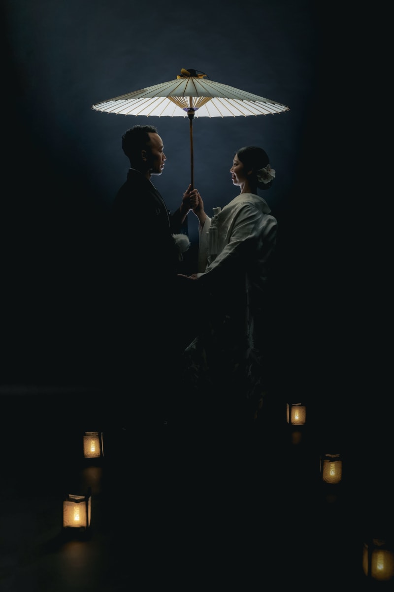 お二人のご希望に合わせて黒背景での撮影も行い、灯籠を配置して落ち着いた世界観を表現しました。