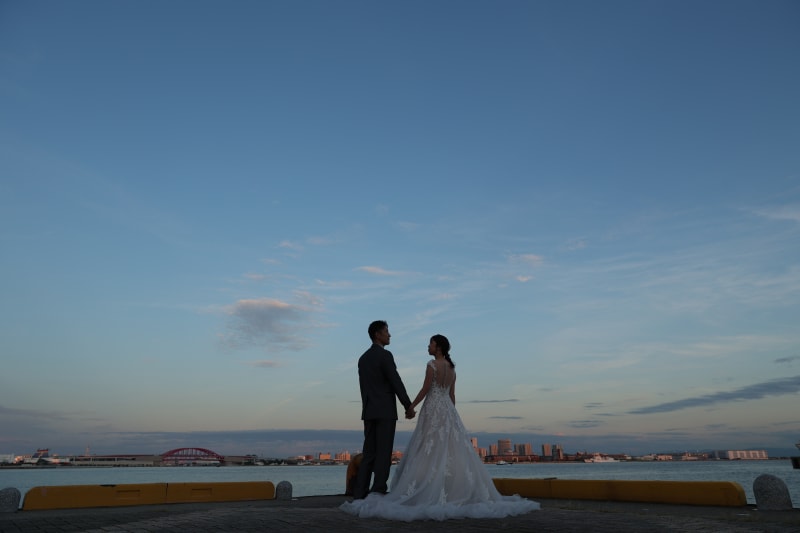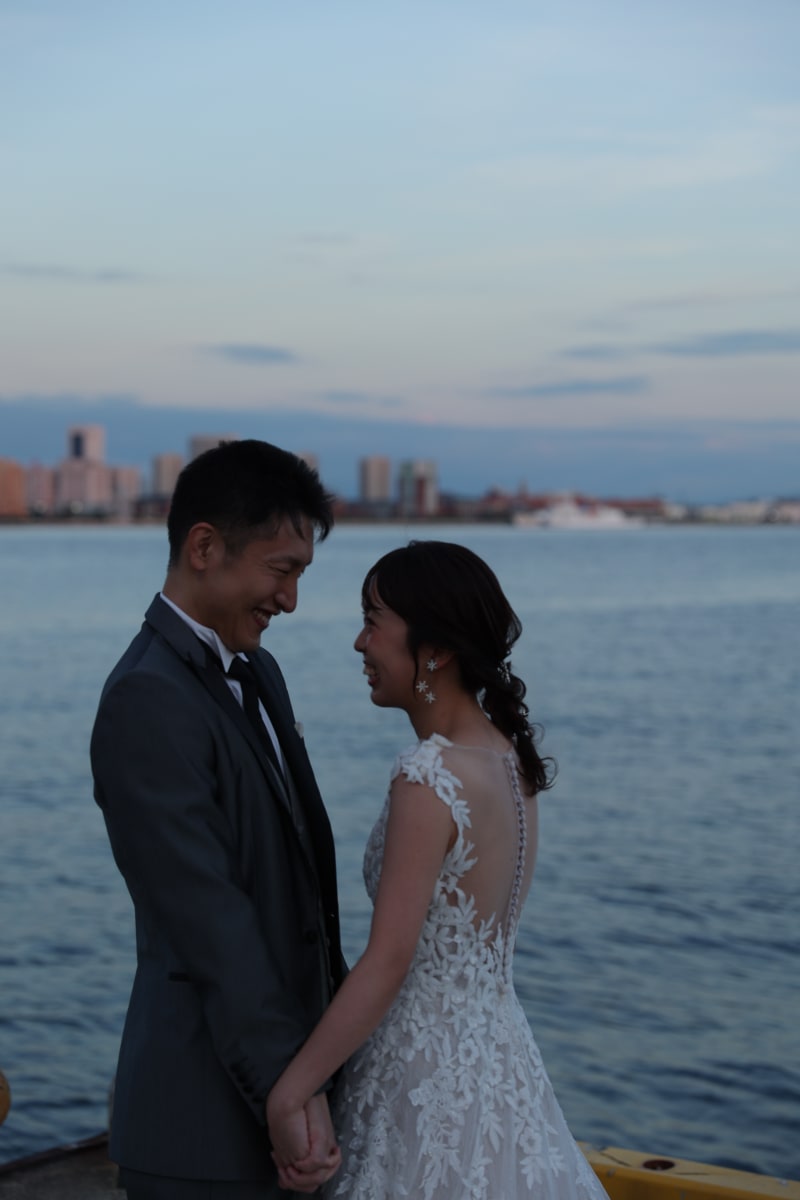 夕暮れに染まる空の下、手を取り合って見つめ合うおふたり。