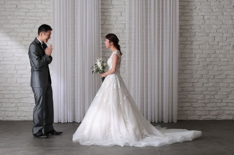 ドレス姿を見た新郎様の笑顔と、少し照れたような新婦様の表情がとても印象的なワンシーン。