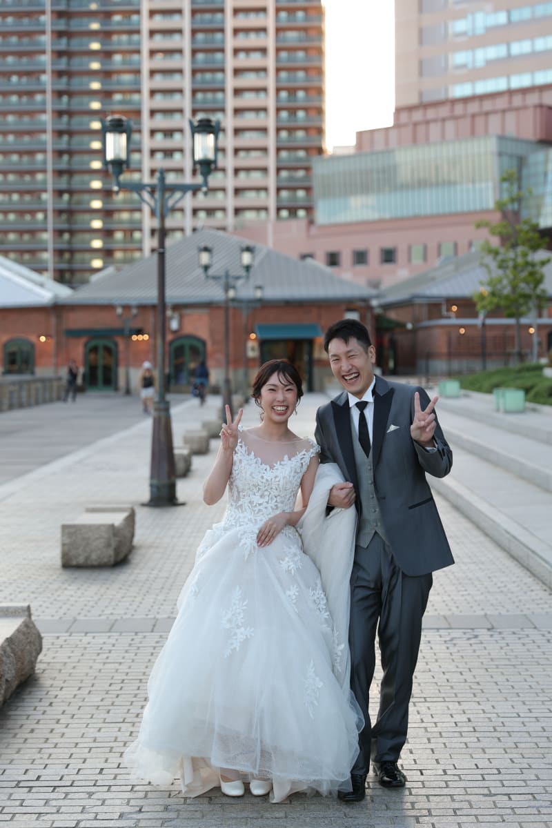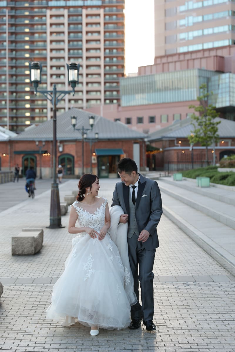 少しずつ夕暮れに染まる街の中を、笑い合いながら歩くおふたりがとても可愛いですね!