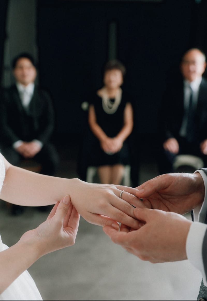 ご家族に見守られての指輪交換シーン💍あたたかさが残るこちらの写真は新郎新婦様はもちろん、ご家族様も喜んでくれること間違い無しです!