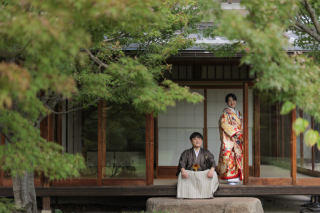 緑に囲まれた静かな園内は、四季折々の自然が美しく、和装が映える撮影スポットです。木々の間からやわらかく差し込む光や、趣ある日本家屋が、より一層おふたりの晴れ姿を引き立ててくれました。