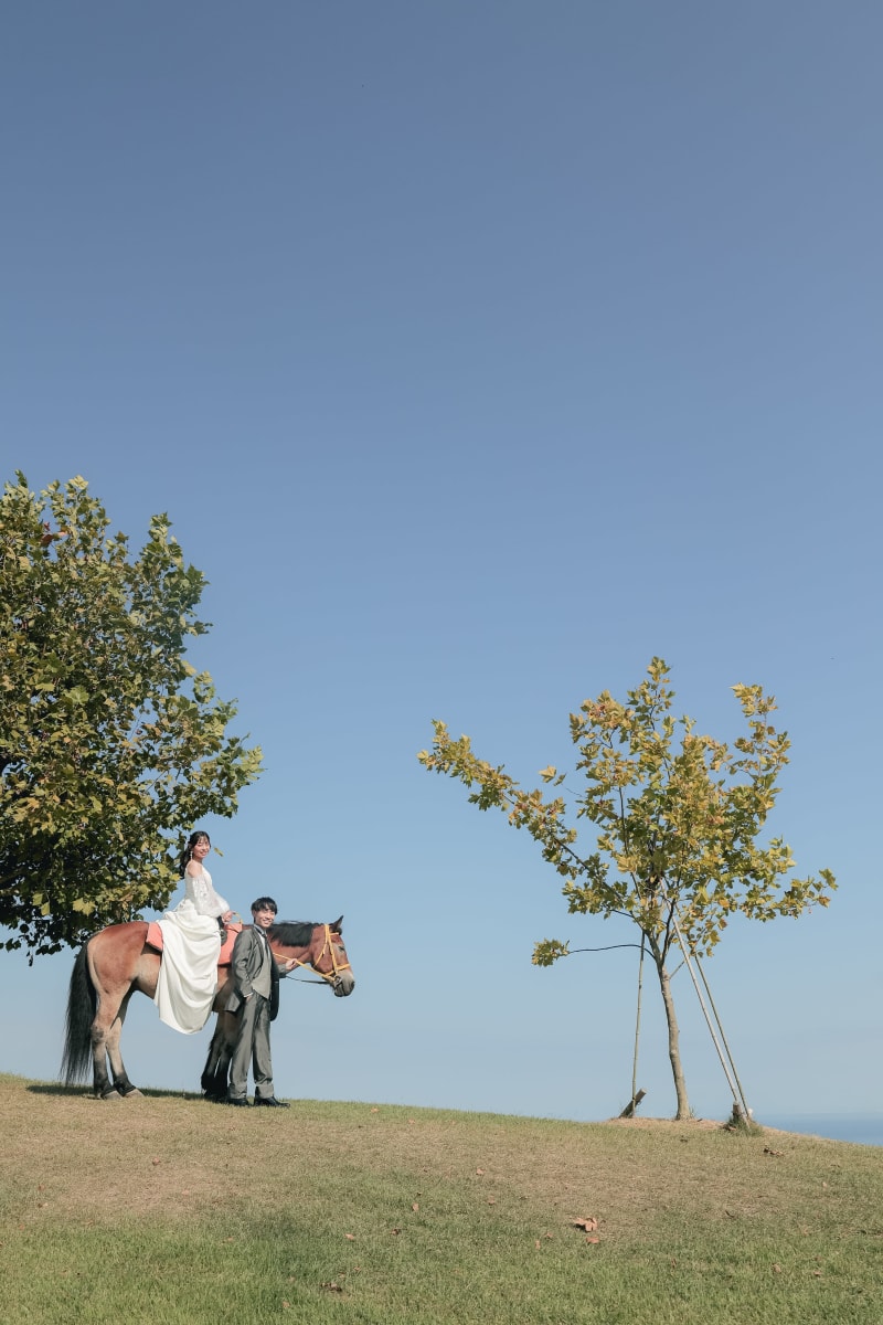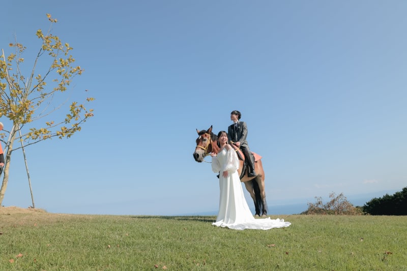 晴れ渡る空の下で、おふたりと馬と自然が織りなす優しい時間。