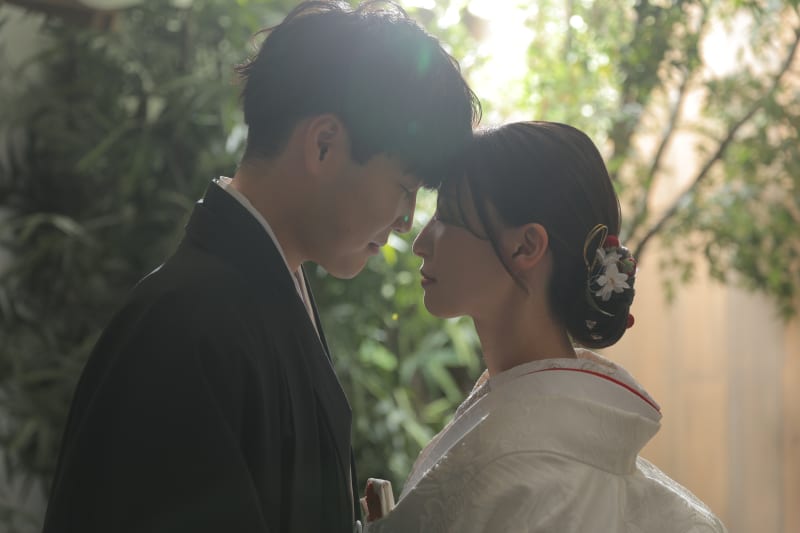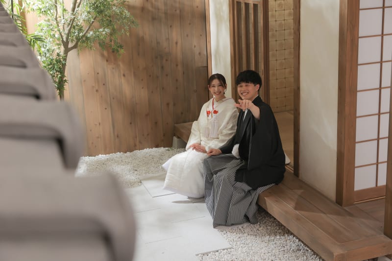 新郎さまの黒紋付袴、新婦さまの白無垢が背景にとても映え、華やぎと品のある雰囲気が広がっています。