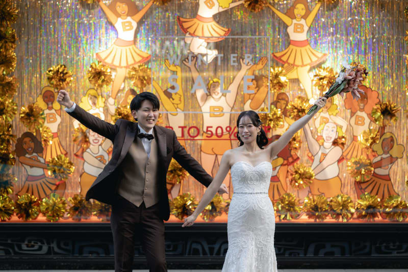 ショーウィンドウの前では、ダンスをしながらの楽しそうなショットも。