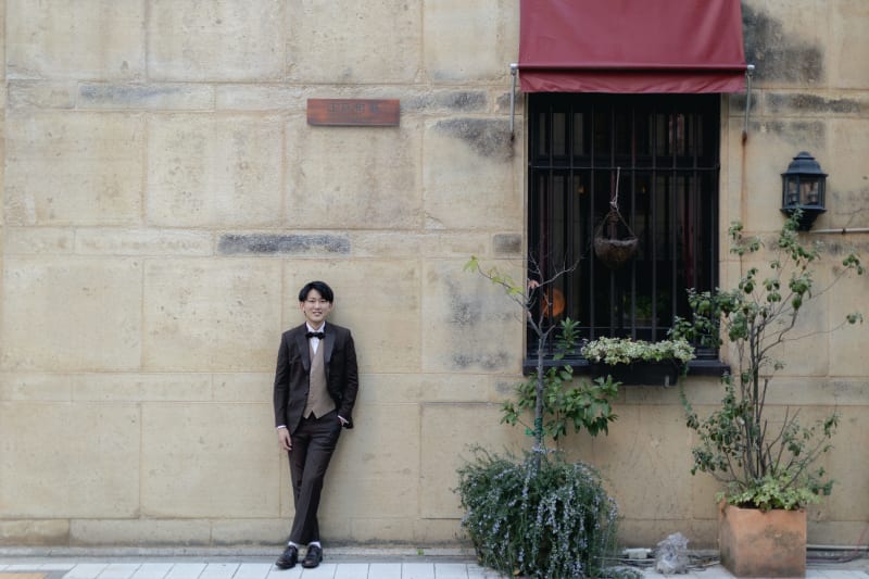 新郎様のソロカットでは、ブラウンのタキシードがクラシックな街並みとよくマッチ。