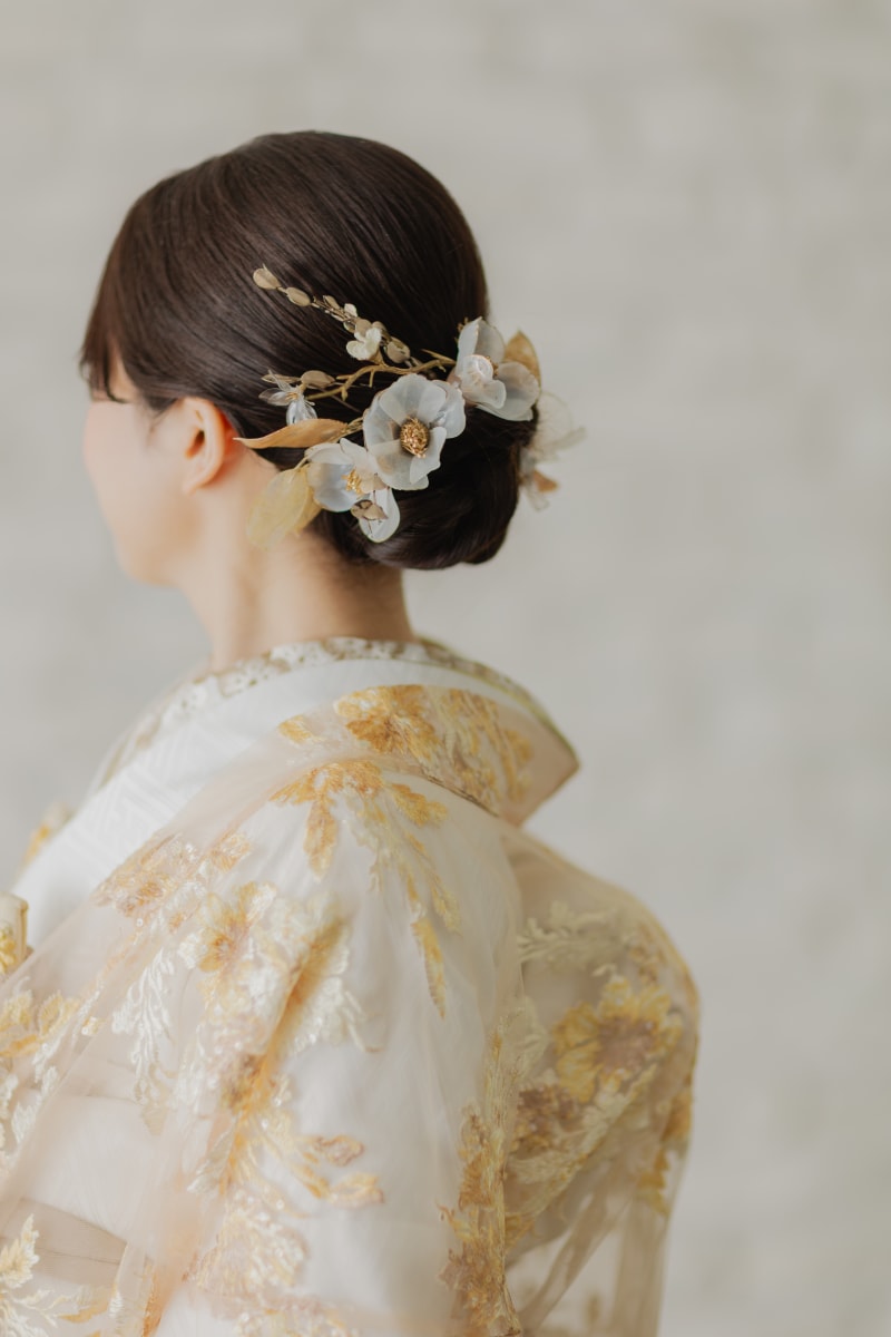 髪飾りにはシースルーのお花とドライフラワーをMIX!