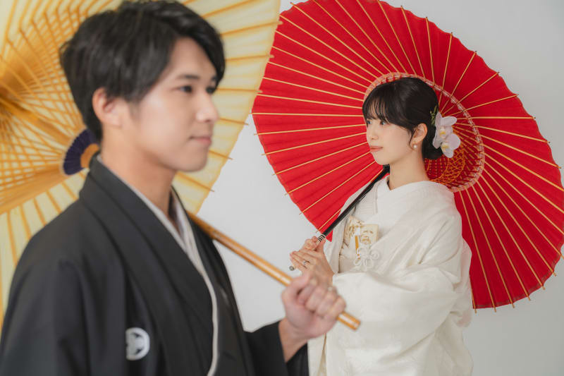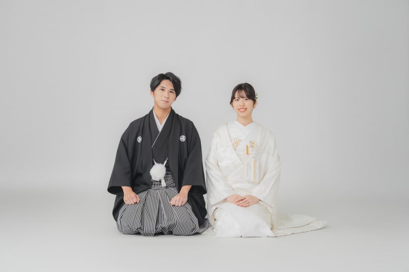 シンプルな背景だからこそ、お衣装やおふたりの表情がより際立ち、洗練された印象に
