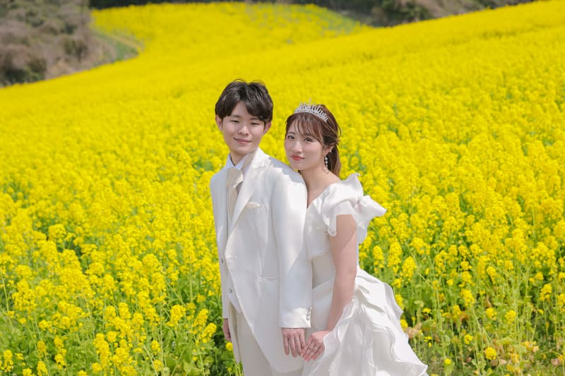 奥まで広がる菜の花畑と、お二人の空気感が合わさって