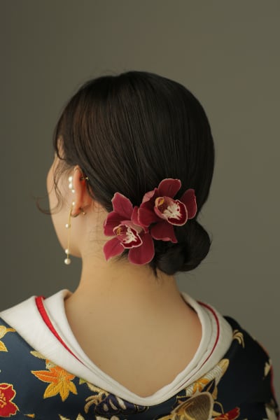 生花のお花が最大限に活きるようにヘアスタイルはシンプルに仕上げ、ウェットな質感の前髪や印象的な後毛をポイントにしました🌷