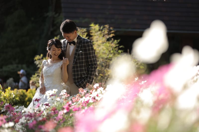 新婦さまの大好きな季節のお花『秋桜(コスモス)』と撮ってもお衣装が馴染んでいますね!!