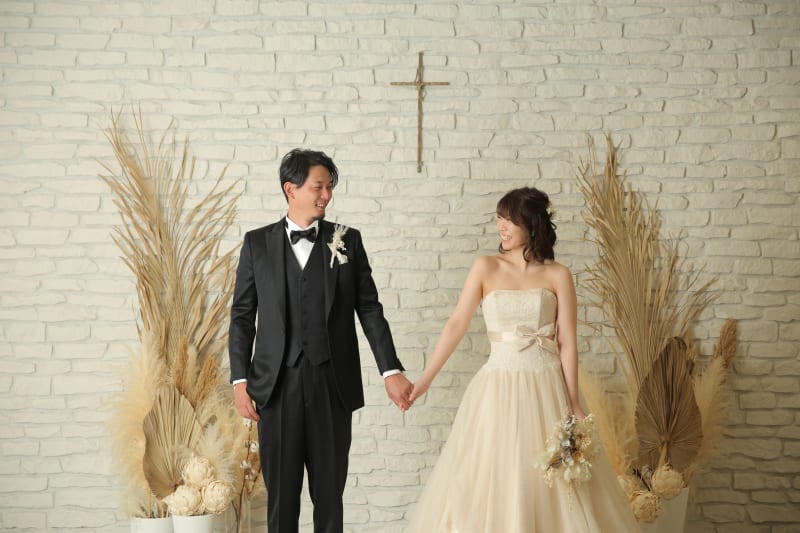 まずは十字架背景のあるレンガの壁です。ここでは十字架背景もあるので、指輪の交換や、ベールアップなど挙式風の写真を撮ることもできます。
