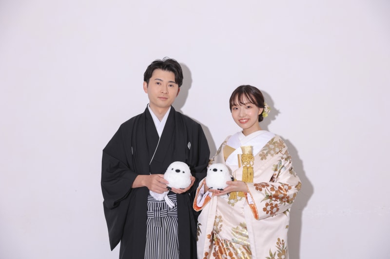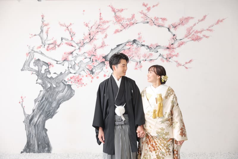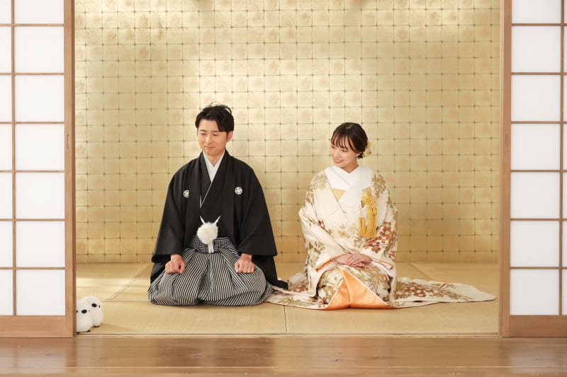 新郎様の黒紋付きと新婦様のお花の色打掛が