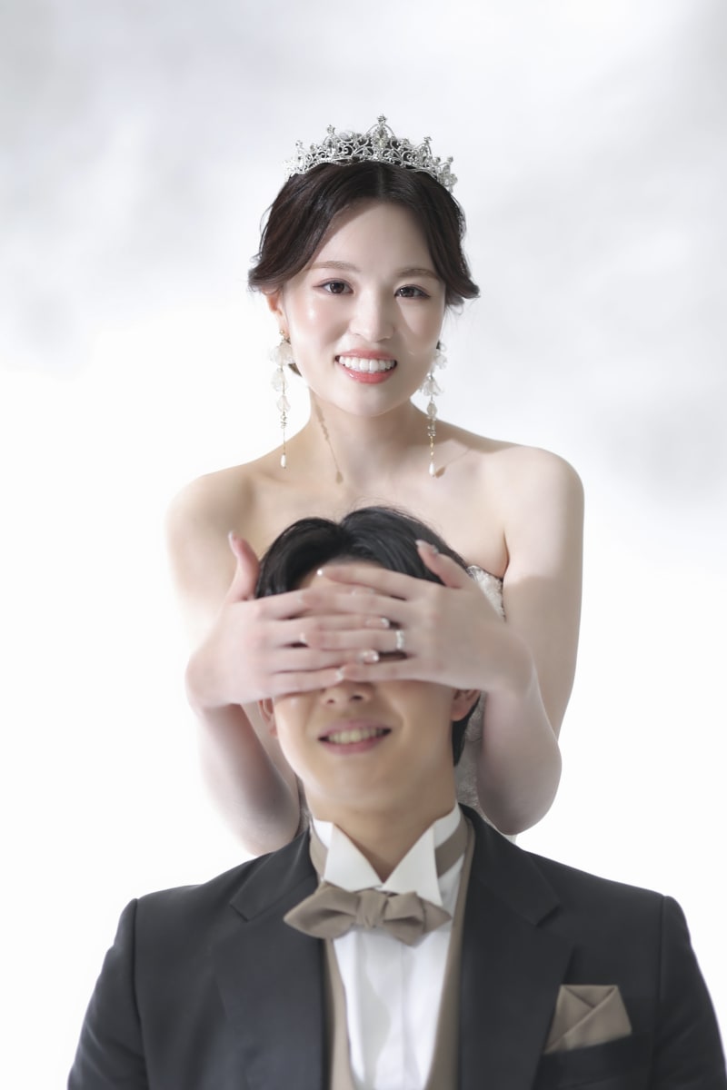 新郎様の目を隠して、指の隙間から新郎さんはカメラ目線。