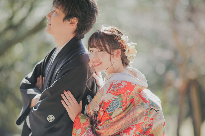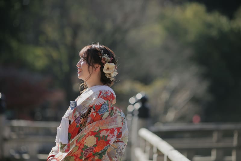 冬のすっきりとした青空が、新婦様の素敵な色打掛を引き立てます。