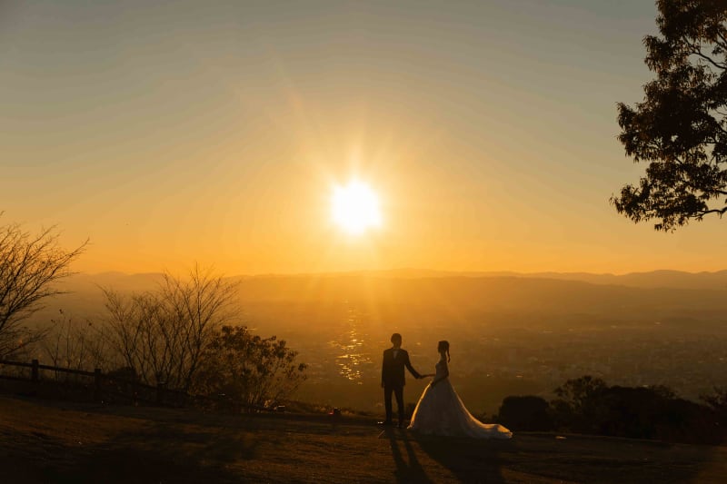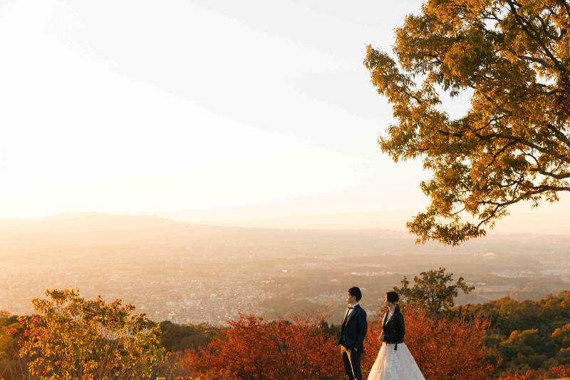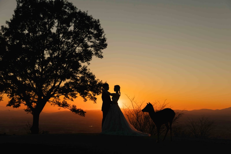 奈良を一望できる若草山で、夕陽や鹿とのショットも