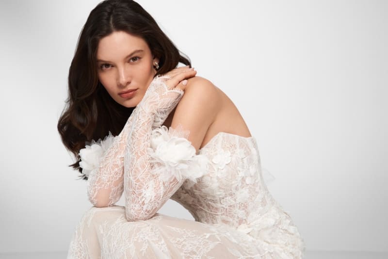 ウィローは、立体的なハンドメイドのお花のアップリケを特徴としたレーススリーブとペアリングすることができます。