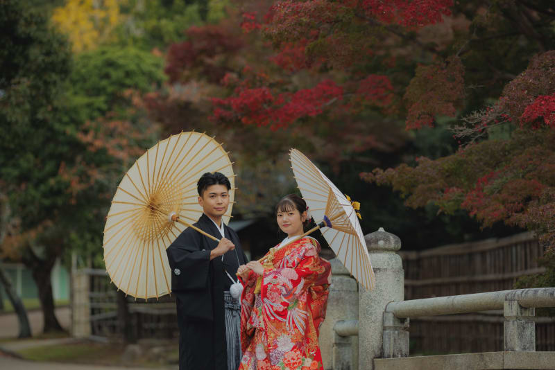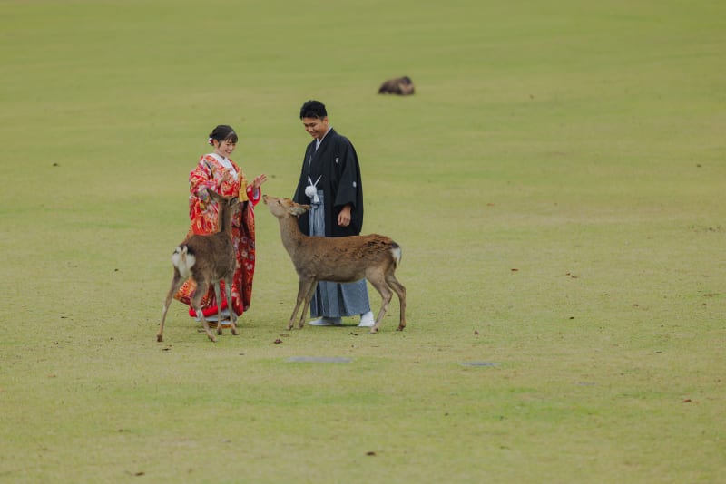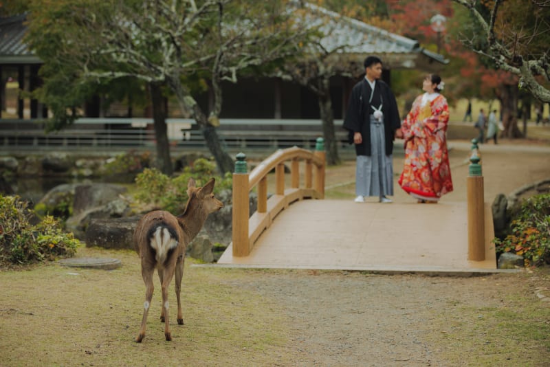 和傘や橋など和装に映えるシチュエーションや、奈良公園名物の鹿ちゃんと一緒に撮影♪