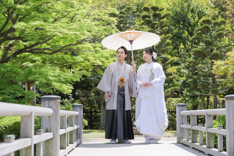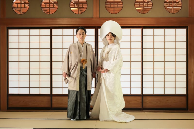 純白の衣装にベージュのコーディネート、新郎様もベージュの紋付でおふたりの雰囲気にぴったりでした!